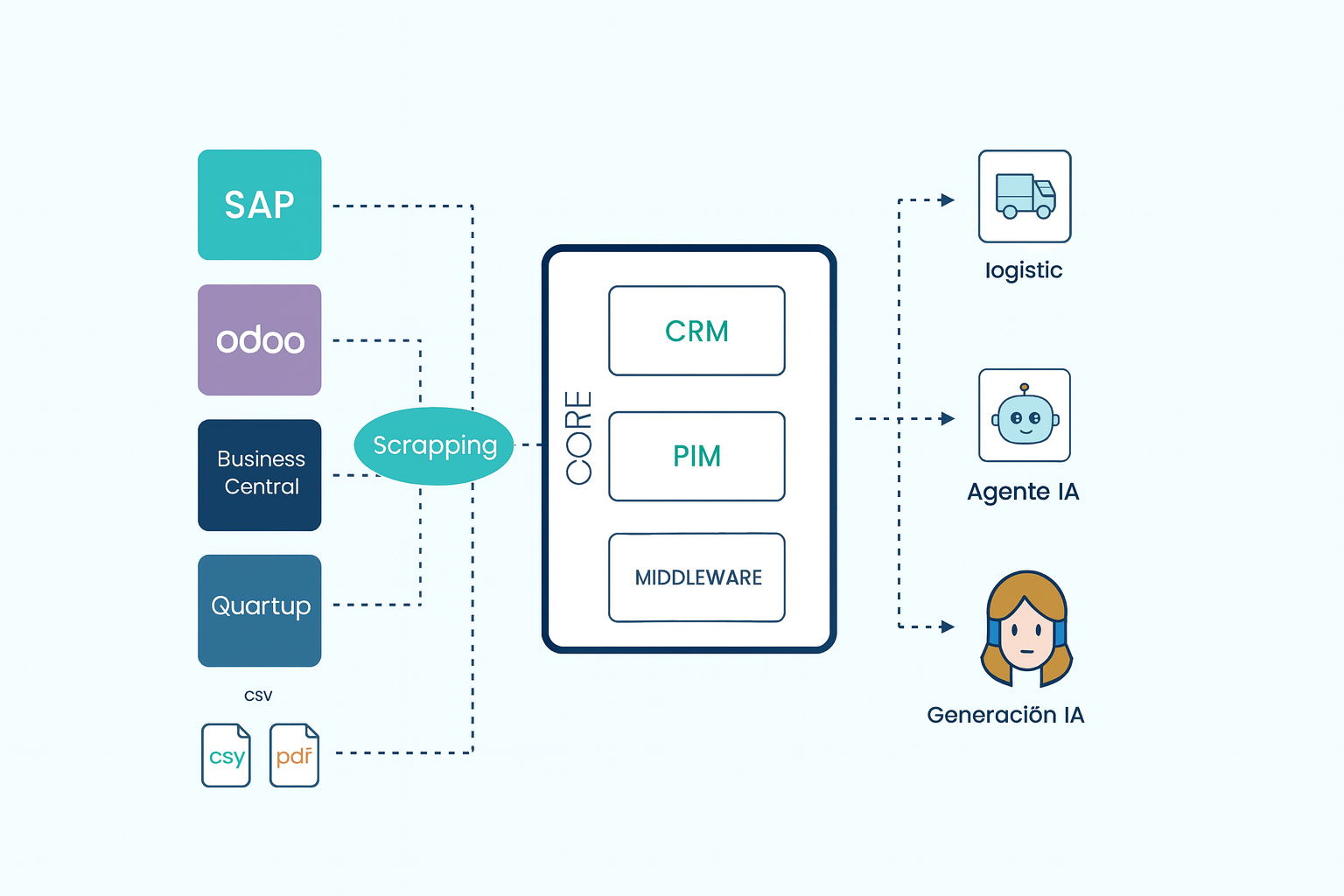 actúa como middleware inteligente, conectando los sistemas que ya usas —como SAP, Odoo,